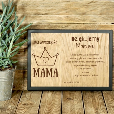 Postaraj się aby Twoje Życzenia czy Podziękowania, które złożysz w tym roku swojej Mamie były wyjątkowe, płynące od serca. Zainspiruj się naszym pomysłem, uwolnij swoją kreatywność i podaruj na Dzień Mamy, albo z Okazji Urodzin czy Imienin Mamy tę Spersonalizowaną drewnianą Grafikę ścienną oprawioną w ramę z wygrawerowaną dedykacją i wspaniale prezentującą sięmotywem Jej Wysokość Mama. Tym razem postaw na Pomysłowy Personalizowany Prezent dla ukochanej Mamy.