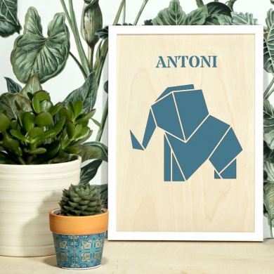 GEOMETRYCZNE ZWIERZĘTA SŁOŃ Drewniany obraz personalizowany z grafiką w kolorze w ramie drewnianej